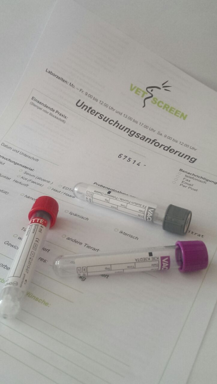 Blutuntersuchung Pferd und Hund zb. Präventiv-Screen: Diese Screen enthält das grosse Blutbild , die Spurenelemente Kupfer, Zink, Selen,Magnesium, Calcium, Natrium, Kreatinin, Phospat,zur Beurteilung auch der Mineralversorung .